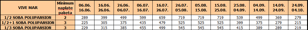 Cene u tabeli su izražene na bazi polupansiona po sobi za 10 noćenja.